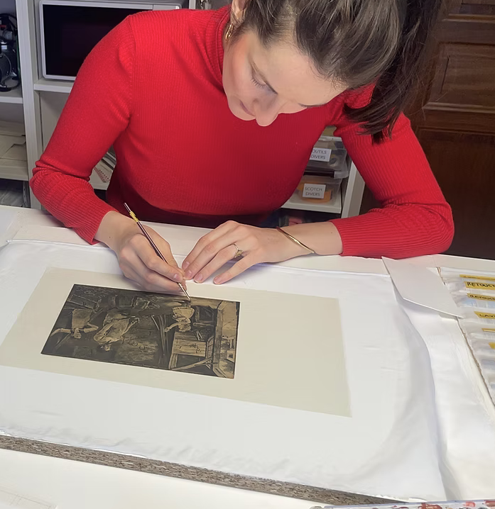 Je lui ai confié plusieurs pièces dont l’état laissait penser qu’elles ne retrouveraient jamais leur éclat d’origine. Elle a su, avec précision et exigence, leur redonner leur prestance et leurs couleurs. Son travail consiste à intervenir sans effacer, à réparer sans réinventer, dans le respect de l’artiste, de la matière et du temps. Chaque geste est mesuré, chaque intervention pensée.